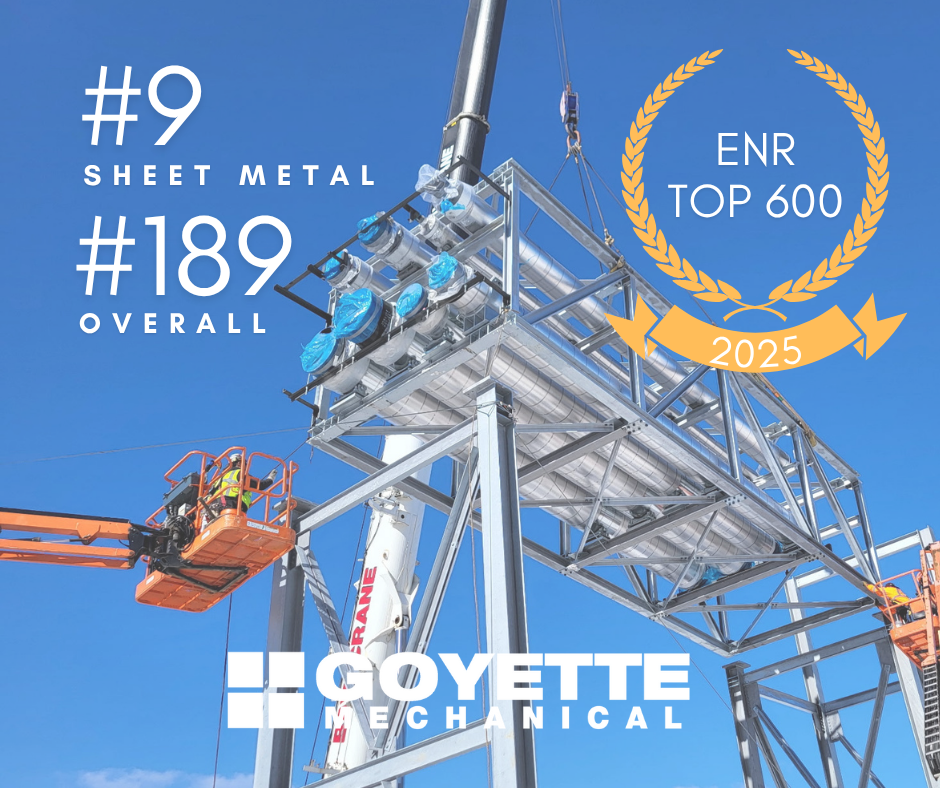 We are honored to announce that Goyette Mechanical has once again been recognized in this year's Engineering News Record (ENR) Top 600 Specialty Contractors Listing. Goyette's rankings include #9 in sheet metal, upward movement to #189 in overall specialty contractors, and revenue within the top 50 of mechanical contractors nationwide. We are incredibly proud to be recognized by ENR as an industry leader and share our gratitude to our Goyette team and to those who partner with us to innovate and deliver excellence across all market sectors.